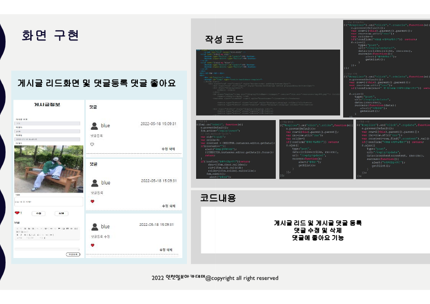• 김찬영 : 전체 css 및 애니메이션 웹 디자인 담당 (메인 페이지, SHOP페이지, 게시글 페이지, 공지사항, 로그인 페이지 CURD css 및 애니메이션 구현)