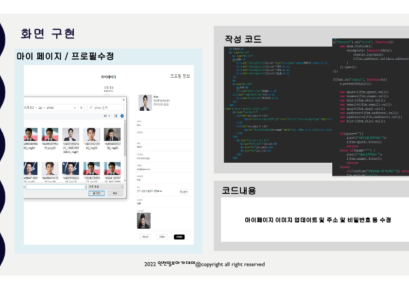 • 양희헌 : 유저 관리 페이지, 유저 로그인, 유저 비밀번호 재발급기능, 회원가입 페이지, 마이 페이지, 유저 수정 및 탈퇴신청, 관리자페이지, 공지사항 페이지, 1:1 문의 채팅